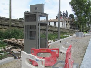 - Quai 4b de la future station « Peyrou – Arc de Triomphe », vue sur la cabine où sera installé le distributeur automatique de titres de transport. Photo prise le samedi 23 avril 2016. Copyright : Edouard Paris