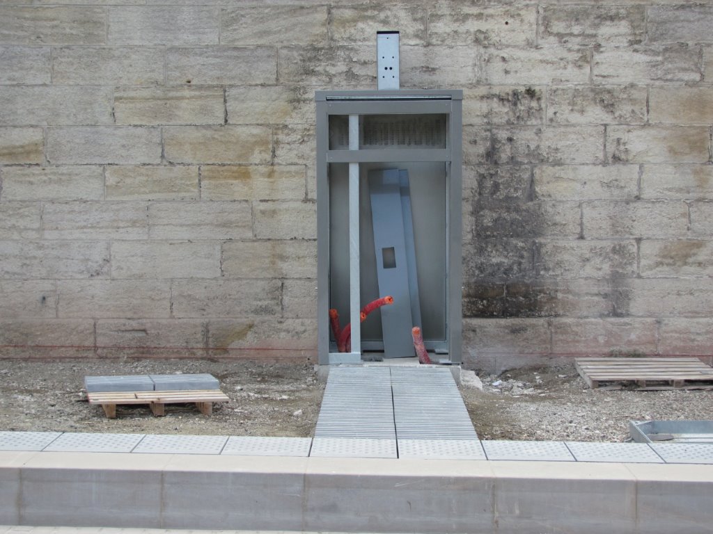 Quai 4a de la future station « Peyrou – Arc de Triomphe », vue sur la cabine où sera installé le distributeur automatique de titres de transport. Photo prise le samedi 23 avril 2016. Copyright : Edouard Paris