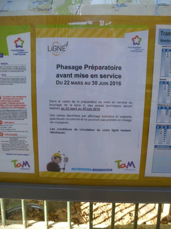 Photographie de l’affichette informant des essais sur le chaînon manquant de la ligne 4 de tramway, prise à la station « Place Albert 1er », commune aux lignes 1 et 4, le vendredi 29 avril 2016. Copyright : Michel Bozzola