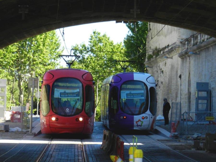 Les rames 2048, à gauche, et 2049, à droite, Citadis 302 Alstom multilignes, se croisent sur le boulevard du Professeur Louis-Vialleton à Montpellier, à la hauteur de la future station « Peyrou – Arc de Triomphe », au cours des essais de circulation sur le chaînon manquant de la ligne 4 de tramway, le vendredi matin 29 avril 2016. Copyright : Anje34