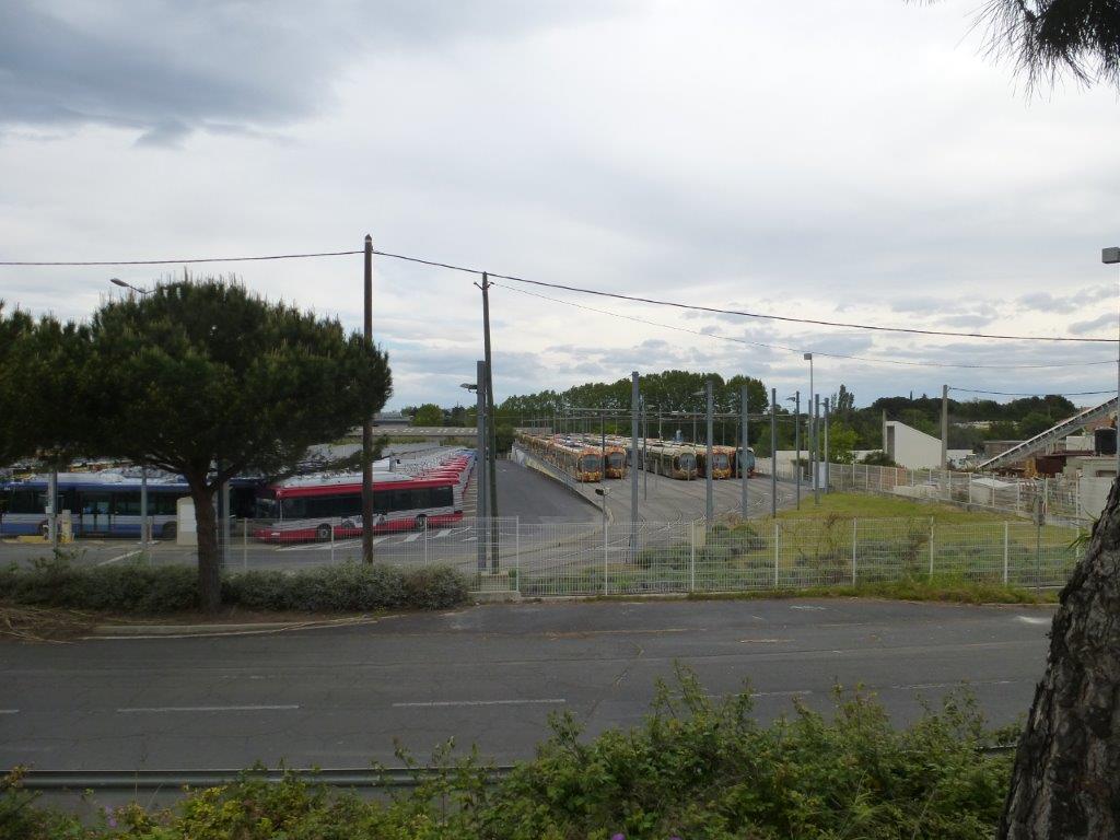 Au dépôt « La jeune Parque », zone industrielle Garosud à Montpellier, les rames des lignes 2 et 4 sont photographiées pantographes baissés sur les voies en tiroir du garage extérieur, le dimanche 1er mai 2016. Copyright : Louis Ferdinand