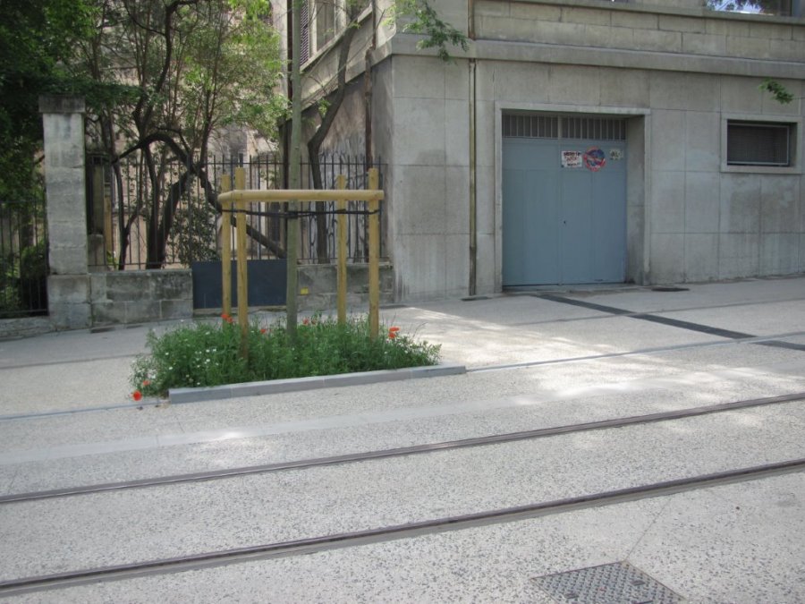 Boulevard Henri IV à Montpellier, à gauche du platane planté au mois de décembre 2015, les traces d’un ancien emplacement de sucette double face JCDecaux, installée en toute illégalité l’espace de quelques jours, ont été effacées. Photo prise le samedi 7 mai 2016. Copyright : Edouard Paris