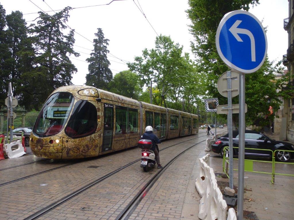La rame 2043 Citadis 302 Alstom est photographiée boulevard du Professeur Louis-Vialleton à Montpellier, au niveau du carrefour avec la rue du Faubourg-Saint-Jaumes, le mardi matin 10 mai 2015. A noter, sur la droite de la photo, la présence d’un miroir routier de belle facture pour sécuriser la sortie des véhicules d’un certain Robert Subra. Copyright : Michel Bozzola