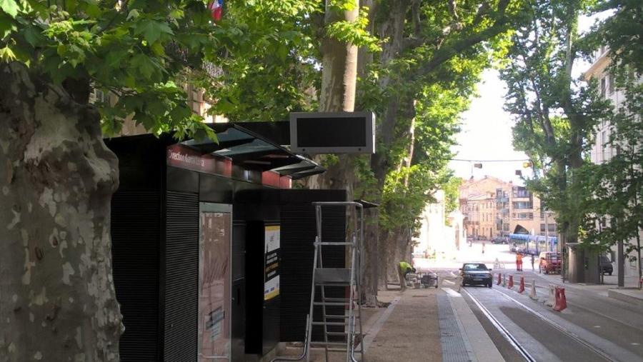 Panneau électronique d’information de marque Solari di Udine installé au-dessus de l’abri central du quai 4b de la future station « Albert 1er – Cathédrale », le jeudi 12 mai 2016. Copyright : Edouard Paris