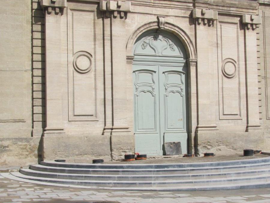 Le jeudi 12 mai 2016, au lendemain de l’inauguration de la place Albert 1er à Montpellier dans sa nouvelle configuration, des dalles restent à poser devant la porte d’entrée de l’ancien Hôpital Général. Copyright : Edouard Paris