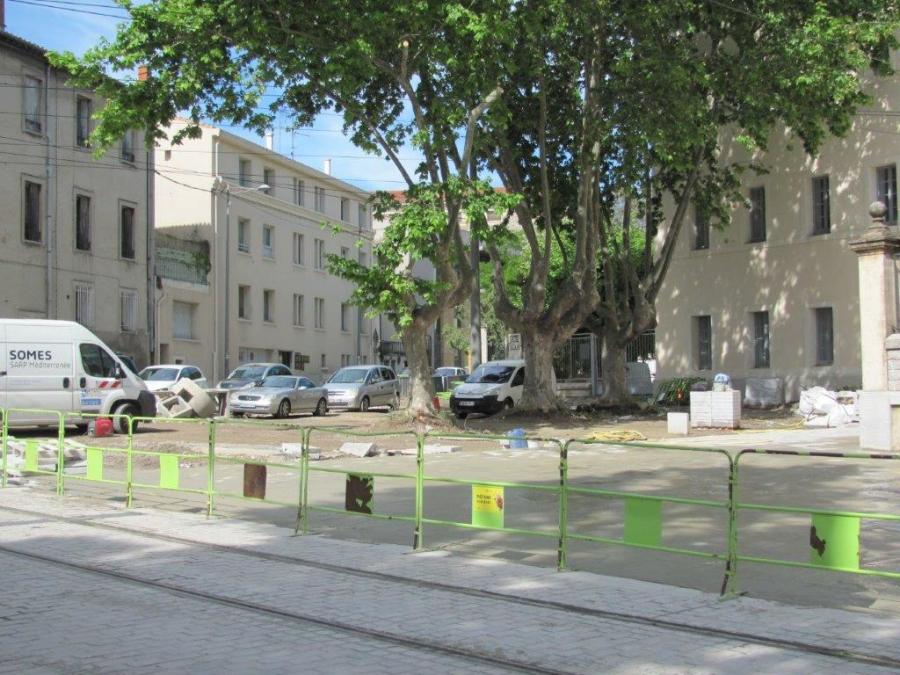 Le jeudi 12 mai 2016, au lendemain de l’inauguration de la place Albert 1er à Montpellier dans sa nouvelle configuration, le chantier se poursuit aux abords de la rue Auguste-Broussonnet. Copyright : Edouard Paris