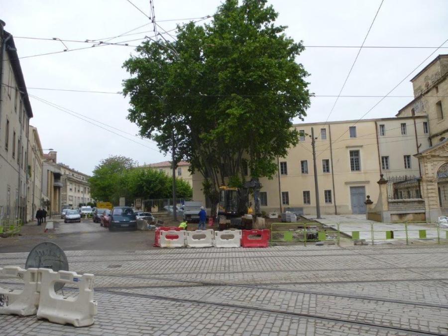 Le mercredi matin 11 mai 2016, à moins de six heures de son inauguration, la place Albert 1er à Montpellier est toujours en chantier. Copyright : Louis Ferdinand