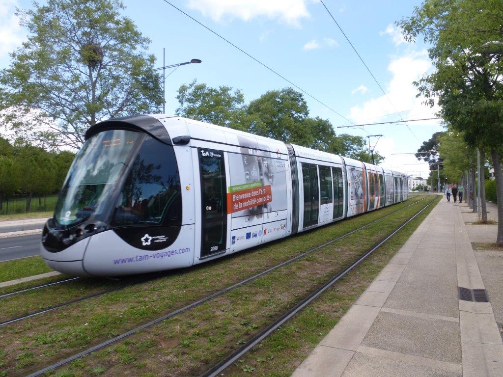 La rame 2098 Citadis 402 Alstom multiligne habillée d’un pelliculage intégral, qui marque le lancement par TaM Montpellier 3M du nouvel Espace Mobilité en ligne, est photographiée à l’approche de la station « Château d’Ô » sur la ligne 1, le lundi 23 mai 2016. Copyright : Louis Ferdinand