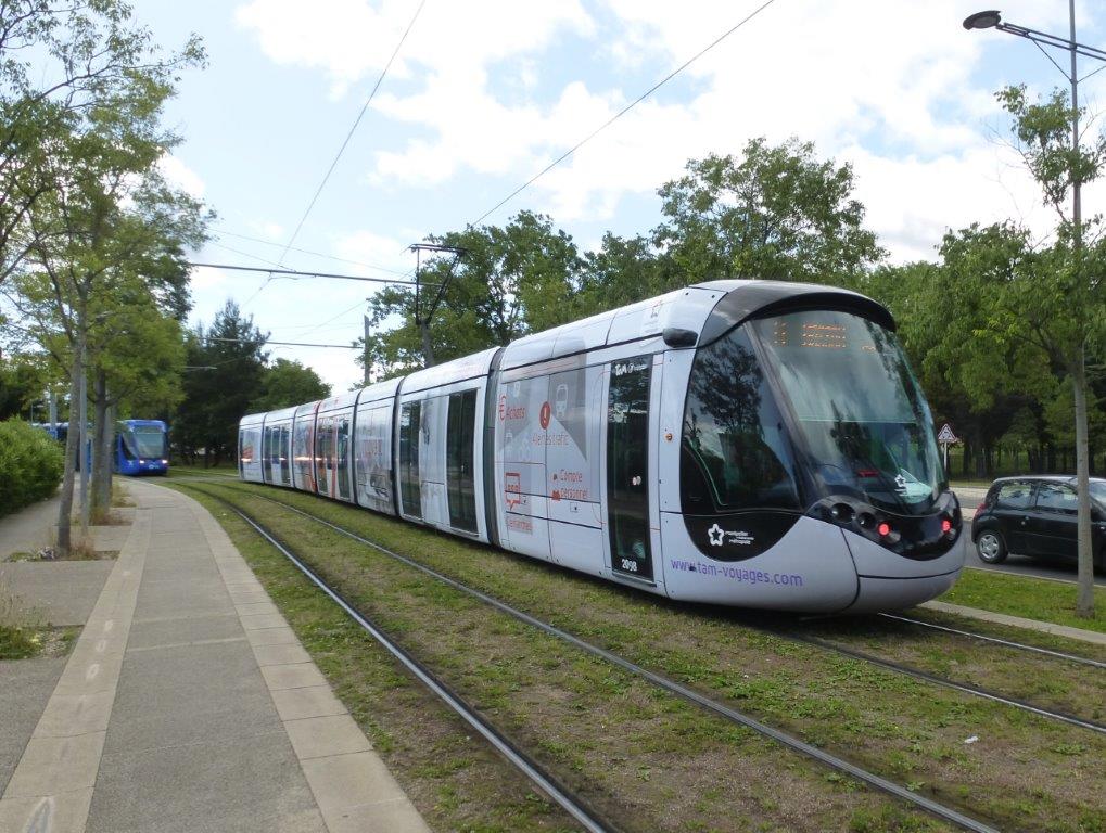 La rame 2098 Citadis 402 Alstom multiligne habillée d’un pelliculage intégral, qui marque le lancement par TaM Montpellier 3M du nouvel Espace Mobilité en ligne, est photographiée peu après son départ de la station « Château d’Ô » sur la ligne 1, le lundi 23 mai 2016. Copyright : Louis Ferdinand