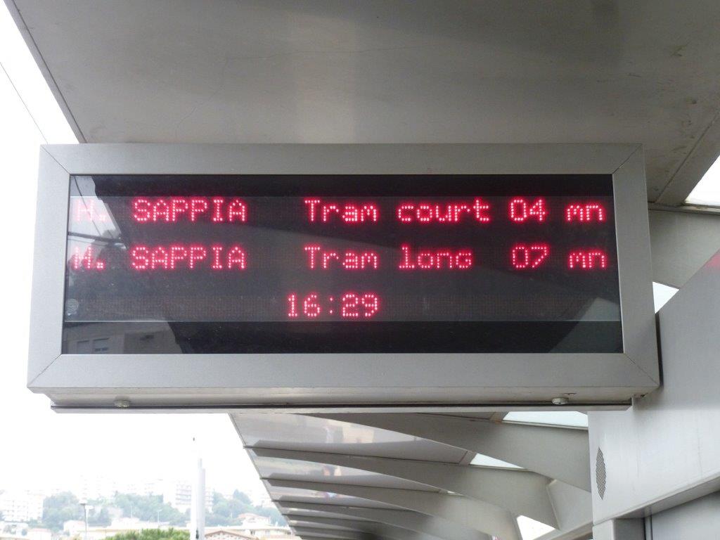 A Nice, sur le T1, les tableaux électroniques d’information des stations précisent si la rame à venir est courte (Citadis 302 Alstom) ou longue (Citadis 402 Alstom), pour une meilleure répartition des voyageurs sur les quais. Photo prise le samedi 14 mai 2016. Copyright : Michel Bozzola