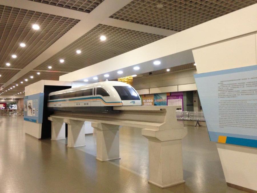 Une maquette du Transrapid est exposée dans la salle des pas perdus de la station du Shanghai Maglev Train de l’aéroport international de Shanghai Pudong. Photo prise le lundi 23 mai 2016. Copyright : Karine D