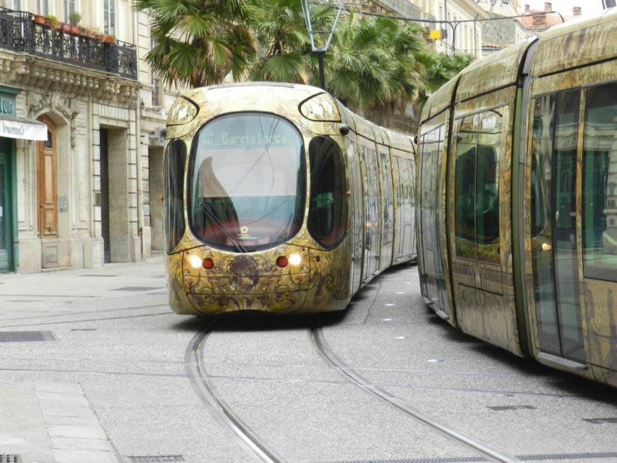 Boulevard du Jeu-de-Paume à Montpellier, les rames 2045 et 2033 Citadis 302 Alstom se croisent à la hauteur de la rue André-Michel, le samedi 28 mai 2016. Copyright : Anje34