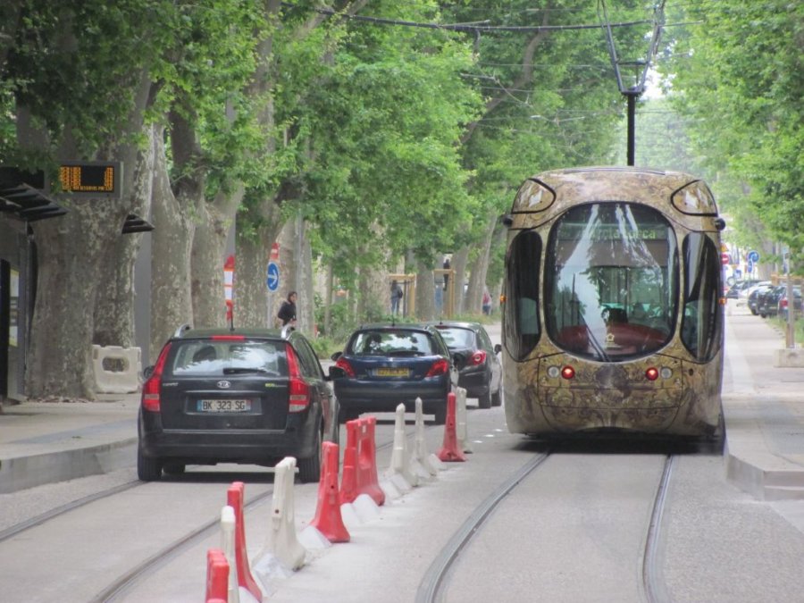 Le samedi 28 mai 2016, alors que la rame 2042 Citadis 302 Alstom est photographiée à la hauteur de la future station « Albert 1er – Cathédrale », quai 4b, des automobilistes à contresens se comportent comme de vrais moutons de Panurge. Copyright : Edouard Paris