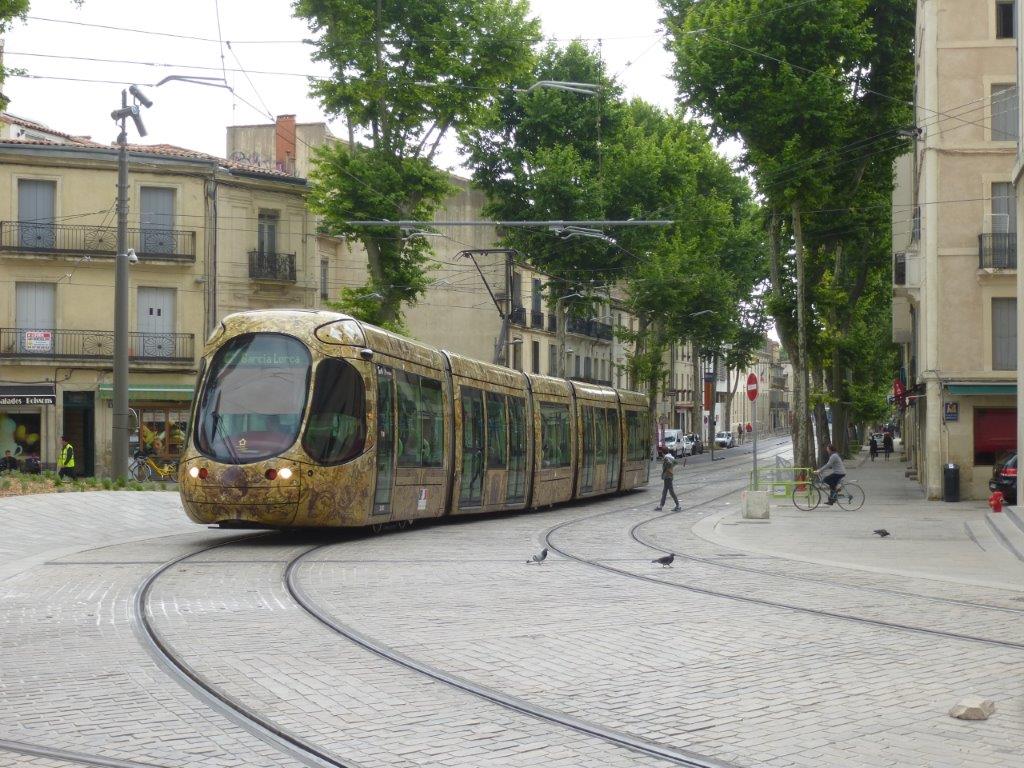 La rame 2042 Citadis 302 Alstom, roulant dans le sens 4b, est photographiée sur la place Albert 1er à Montpellier, entre le boulevard Pasteur et le boulevard Henri IV, le samedi 28 mai 2016. Copyright : Michel Bozzola