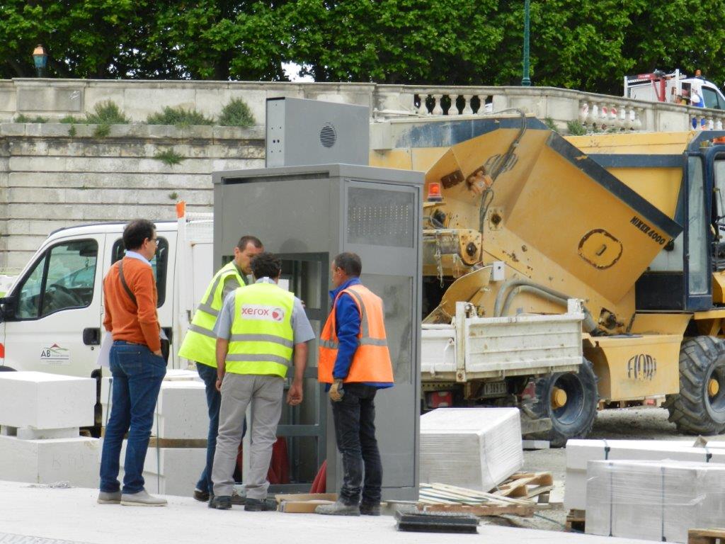 Place d’Aviler à Montpellier, conciliabule devant la cabine déplacée du quai 4b de la future station « Peyrou – Arc de Triomphe », le mardi 31 mai 2016. Copyright : Anje34