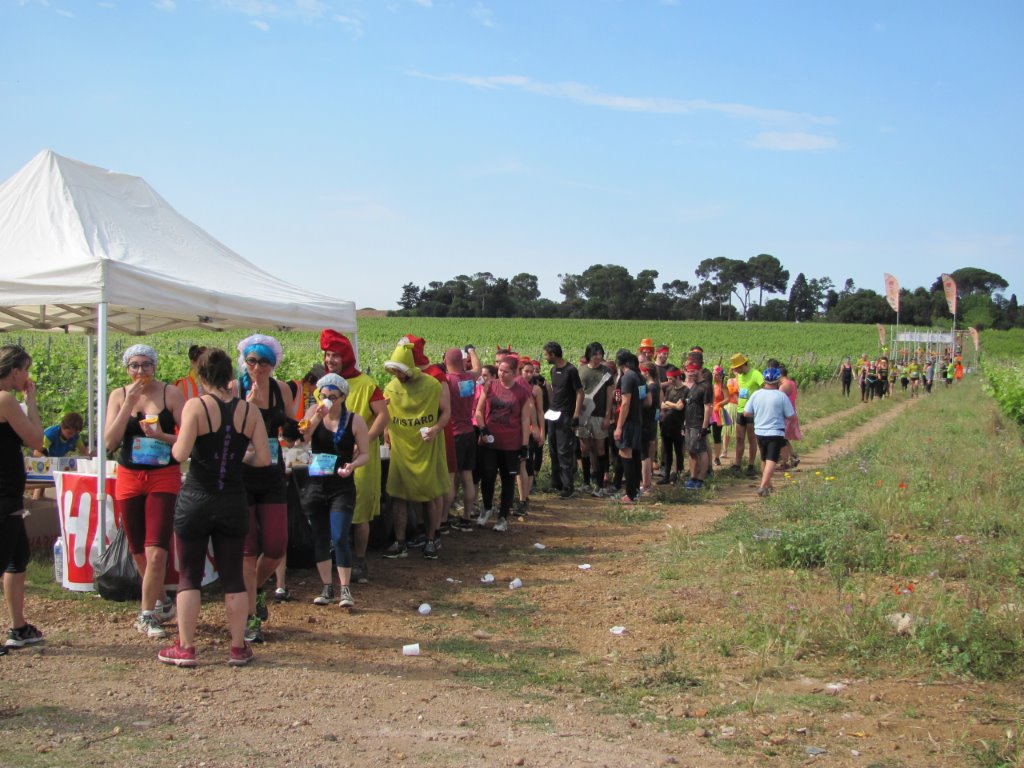 Distribution d’eau de source au point de ravitaillement de l’édition 2016 de la ruée des fadas à Lattes, installé au milieu des vignobles, le samedi 4 juin. Copyright : Edouard Paris