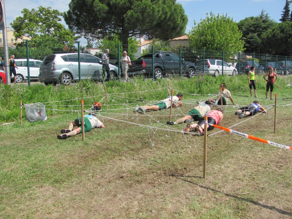 La non moins classique épreuve du passage sous les ficelles électrifiées de l’édition 2016 de la ruée des fadas à Lattes, le samedi 4 juin. Copyright : Edouard Paris