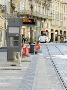 Sur le quai 4a de la future station « Peyrou – Arc de Triomphe », le tableau électronique d’information est soumis à des essais, alors que la cabine, désormais installée place d’Aviler, en bordure du quai 4b, a reçu son distributeur automatique de titres de transport et son tableau électronique d’information.