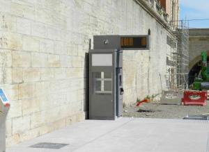 Boulevard du Professeur Louis-Vialleton, le mur de pierre, derrière lequel se trouve la machinerie et les deux futurs ascenseurs, qui assureront la liaison entre la rue Foch et la future station « Peyrou – Arc de Triomphe », a été remonté sauf, bien entendu, au niveau des trois ouvertures créées pour les deux accès ascenseurs et l’accès au local technique (et non à l’escalier comme indiqué précédemment par erreur, note du webmestre) au niveau du boulevard précité. Au-dessus du mur, de nouvelles balustres sont en cours de pose.