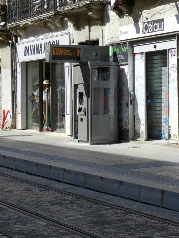 Boulevard du Jeu-de-Paume à Montpellier, la cabine du quai 4a de la future station « Saint-Guilhem – Courreau » a été équipée de son distributeur automatique de titre de transport et de son tableau électronique d’information. Photo prise le vendredi 3 juin 2016. Copyright : Anje34