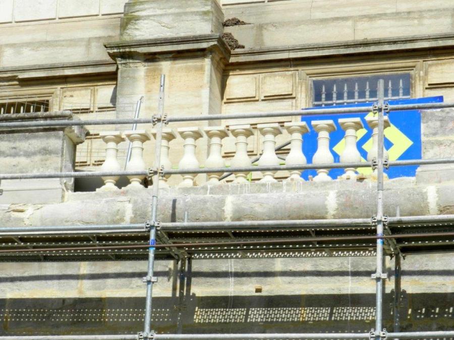 Les nouvelles balustres posées au niveau de la coursive extérieure du Palais de Justice de Montpellier, photographiées le vendredi 3 juin 2016. Copyright : Anje34