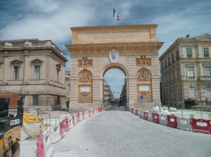 - Sur ce montage photo la rame 2032 Citadis 302 Alstom, affublée du logo « République Française », passe au pied de l’Arc de Triomphe à Montpellier. Photo prise le samedi 11 juin 2016 à la station « Observatoire » des lignes 3 et 4 de tramway. Copyright : Edouard Paris