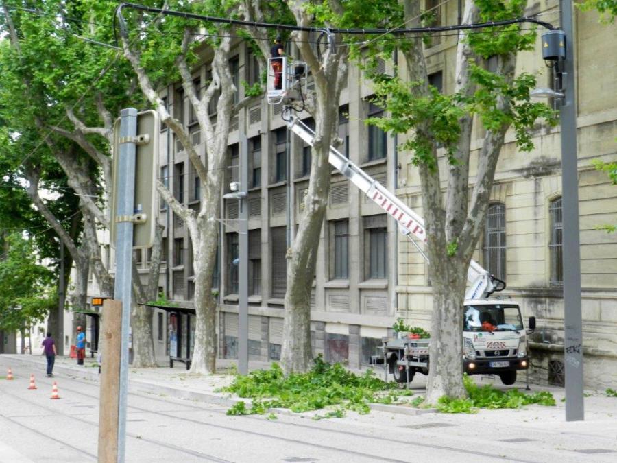 Élagage partiel des platanes du boulevard Henri IV à Montpellier, à proximité de la future station « Albert 1er – Cathédrale », le lundi 6 juin 2016. Copyright : Anje34