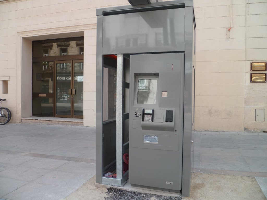 Photo du distributeur automatique de titres de transport de la future station « Saint-Guilhem – Courreau » quai 4b, boulevard du Jeu-de-Paume à Montpellier, le samedi 11 juin 2016. Copyright : Edouard Paris