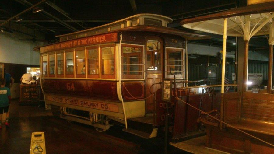 Au Cable Car Museum de San Francisco, la voiture numéro 54 est attelée au grip car numéro 46, dont on aperçoit qu’une partie, le tout datant de 1877 année de l’ouverture de la ligne exploitée par la compagnie Sutter Street Railway. Photo prise le dimanche 29 mai 2016. Copyright : DS7