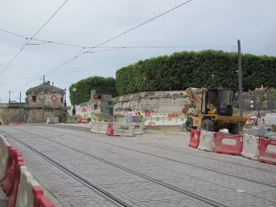 Le long des voies du chaînon manquant de la ligne 4 de tramway, les travaux perdurent comme ici place d’Aviler à Montpellier. Photo prise le samedi 18 juin 2016. Copyright : Edouard Paris