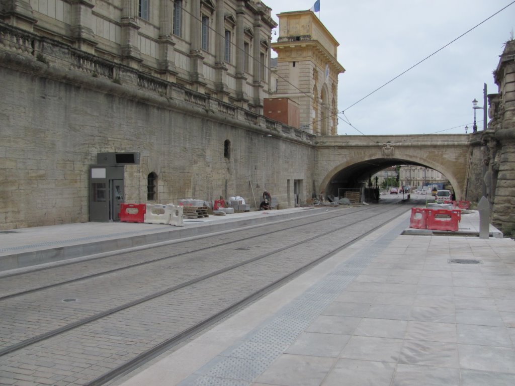 A deux semaines de la mise en service commercial de la ligne 4 de tramway bouclée, le dallage des quais de la future station « Peyrou – Arc de Triomphe » n’est pas terminé. Photo prise le samedi 18 juin 2016. Copyright : Edouard Paris