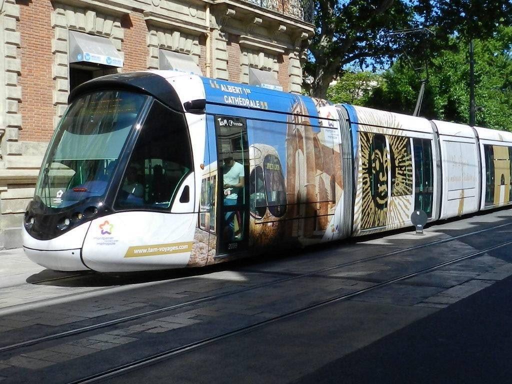 Rue de la République à Montpellier, la rame 2099 Citadis 402 Alstom multiligne est revêtue d’un pelliculage intégral annonçant l’inauguration et la mise en service commercial de la nouvelle ligne 4 de tramway bouclée. Photo prise le mardi 21 juin 2016. Copyright : Anje34