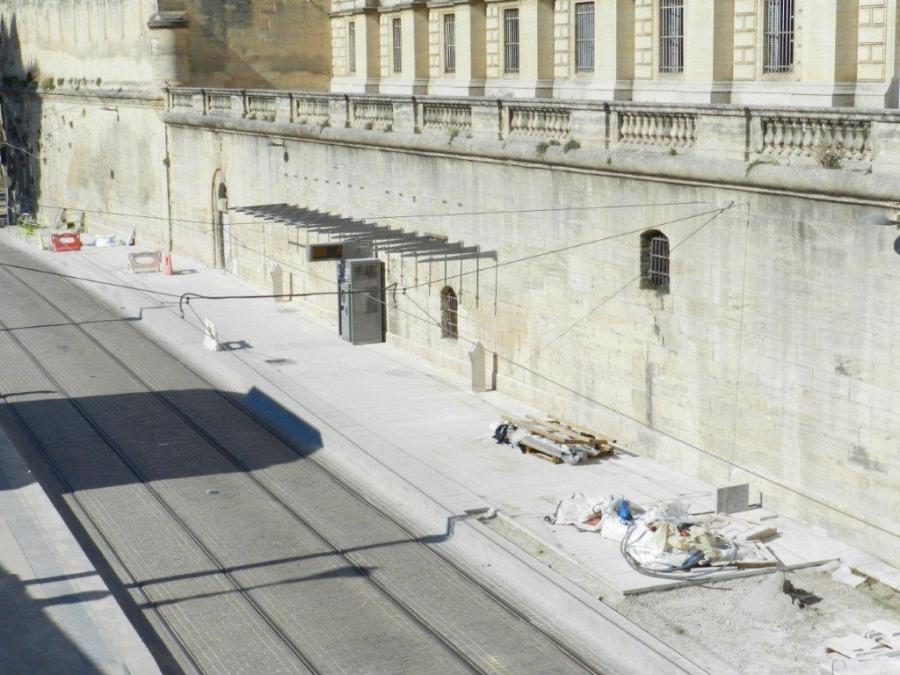 Les voyageurs du quai 4a de la future station « Peyrou – Arc de Triomphe » disposeront d’un auvent pour s’abriter des intempéries. Photo prise le vendredi 24 juin 2016. Copyright : Anje34