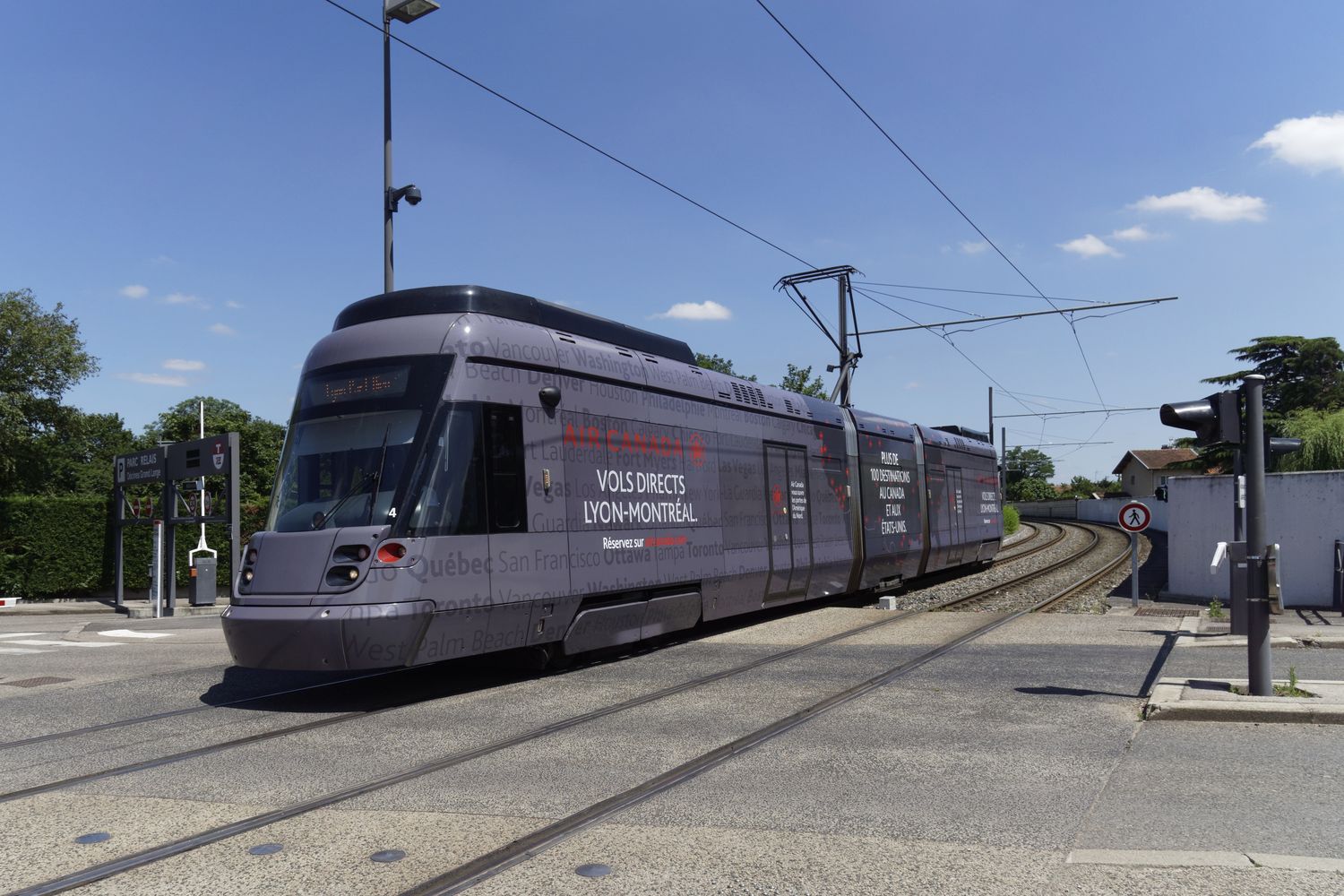 La rame 104 Tango Stadler rhônexpress pelliculée Air Canada est photographiée à la hauteur du passage à niveau qui précède la station « Décines Grand Large » du T3, où elle ne marque pas l’arrêt, le mardi 28 juin 2016. Copyright : Yvon Brument