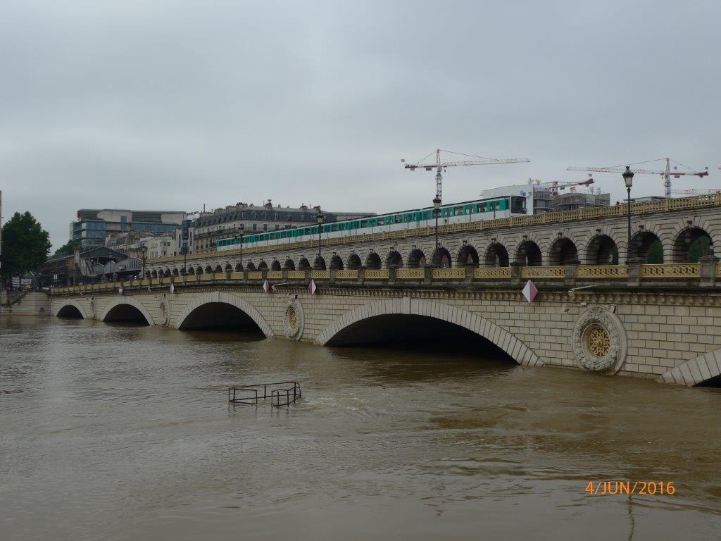 La Seine en crue à Paris au niveau du pont surmonté du viaduc où circule une rame sur pneu MP 73 de la ligne 6 de métro entre les stations « »Quai de la Gare » et « Bercy ». Photo prise le samedi 4 juin 2016. Copyright : Laure C