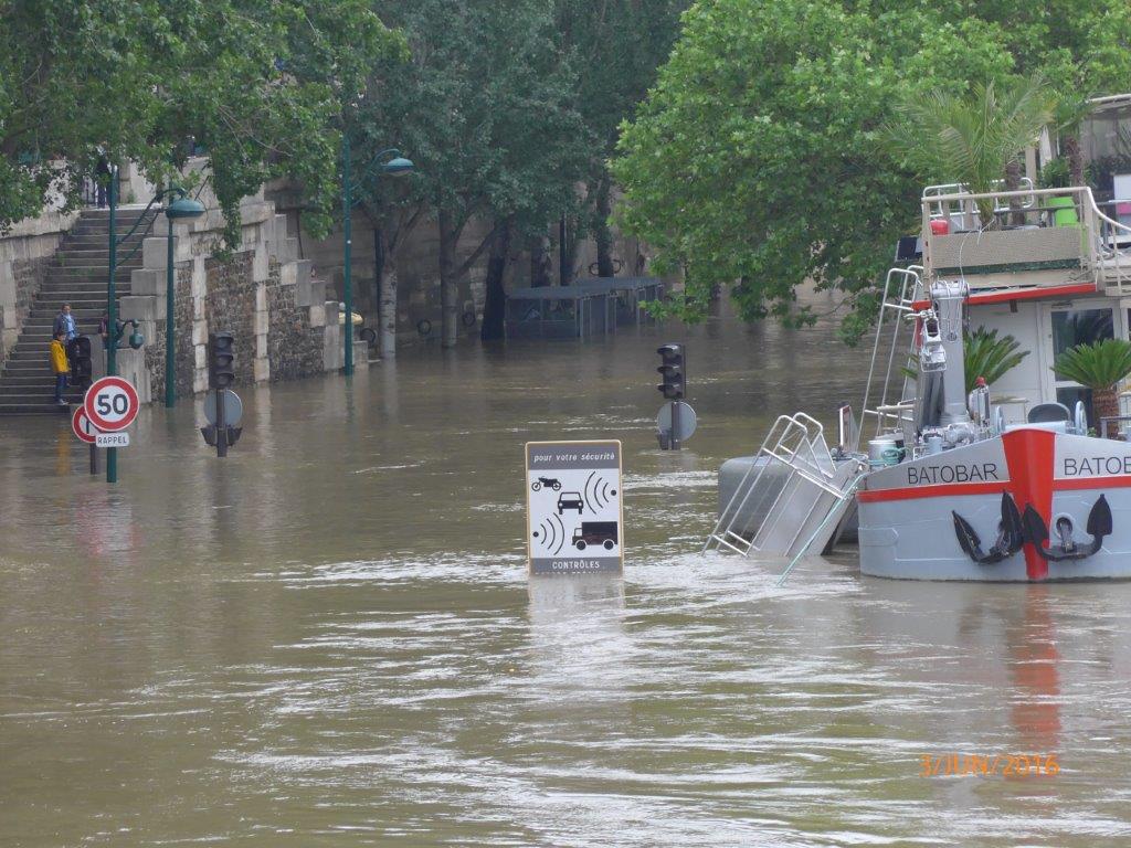 La voie Georges-Pompidou sous les eaux de la Seine en crue à Paris, entre le pont Louis-Philippe et le pont Marie, le vendredi 3 juin 2016. Copyright : Laure C