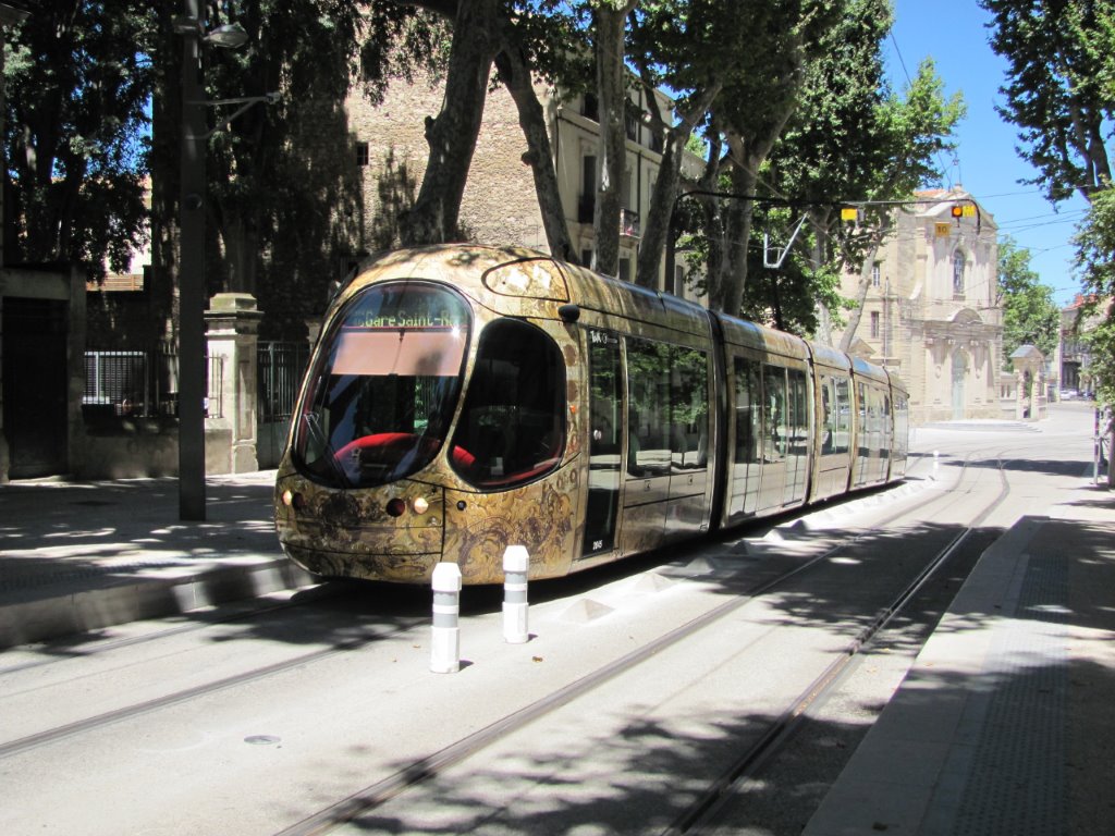 Le vendredi 1er juillet 2016, c’est à cet endroit que le trio VSD (Valls, Saurel, Delga) a coupé le ruban inaugural de la nouvelle ligne 4 de tramway bouclée. Photo prise en bas du boulevard Henri IV à Montpellier, le dimanche 3 juillet 2016. Copyright : Edouard Paris