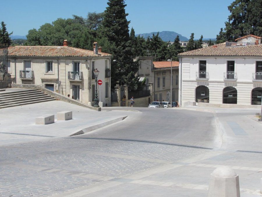 Vue sur les quais de l’arrêt « Peyrou – Arc de Triomphe » des lignes 6 et 7 de bus urbains, rue de La Blottière à Montpellier, le dimanche 3 juillet 2016. Copyright : Edouard Paris