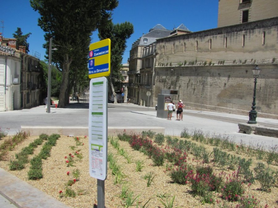 Totem de l’arrêt « Peyrou – Arc de Triomphe » des lignes 6 et 7 de bus urbains, photographié le dimanche 3 juillet 2016. Copyright : Edouard Paris