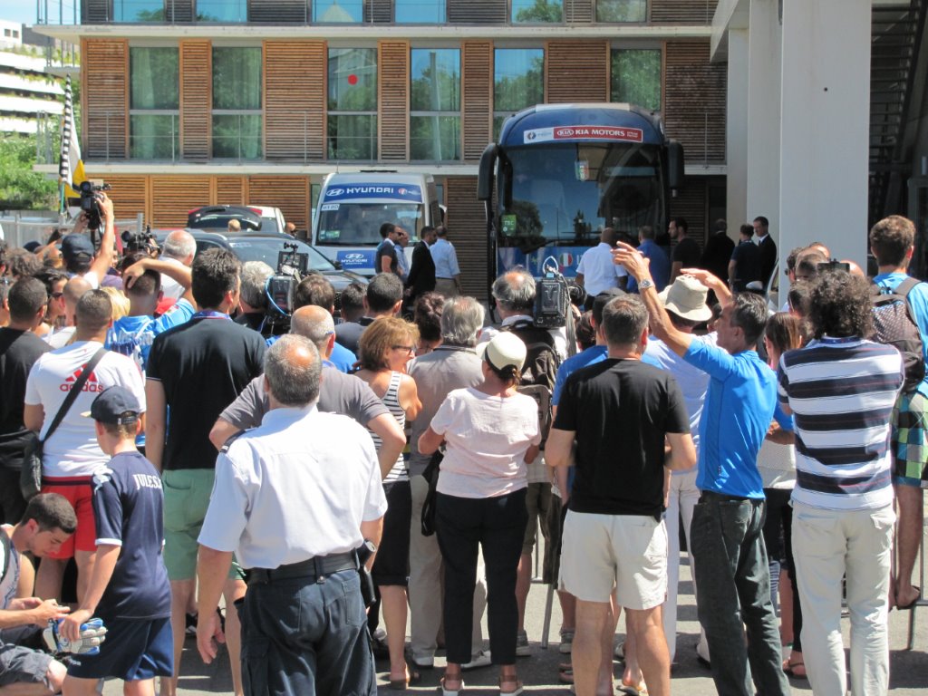 La foule devant l’hôtel Courtyard by Marriott de Montpellier, avant le départ de la Squadra Azzura pour l’aéroport de Montpellier Méditerranée, le dimanche après-midi 3 juillet 2016. Copyright : Edouard Paris