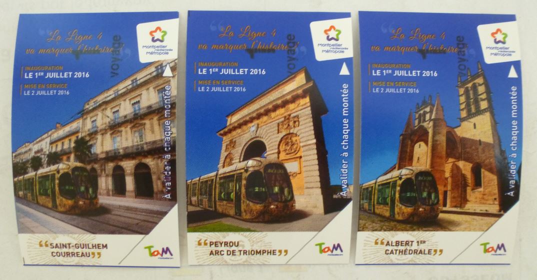 Les trois tickets collector de la ligne 4 de tramway bouclée symbolisent les trois nouvelles stations mises en service : « Saint-Guilhem – Courreau », « Peyrou – Arc de Triomphe » et « Albert 1er – Cathédrale ». Tickets pris en photo par Louis Ferdinand, le jeudi 7 juillet 2016