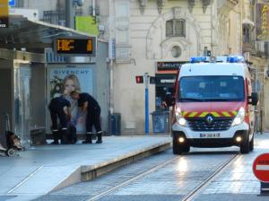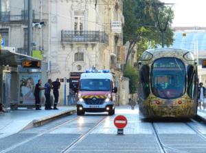 - Rue de la République à Montpellier, les véhicules de nettoiement de la voirie ont toujours la priorité sur les rames de tramway. Photo prise le dimanche 10 juillet 2016 en début de matinée. Copyright : Anje34