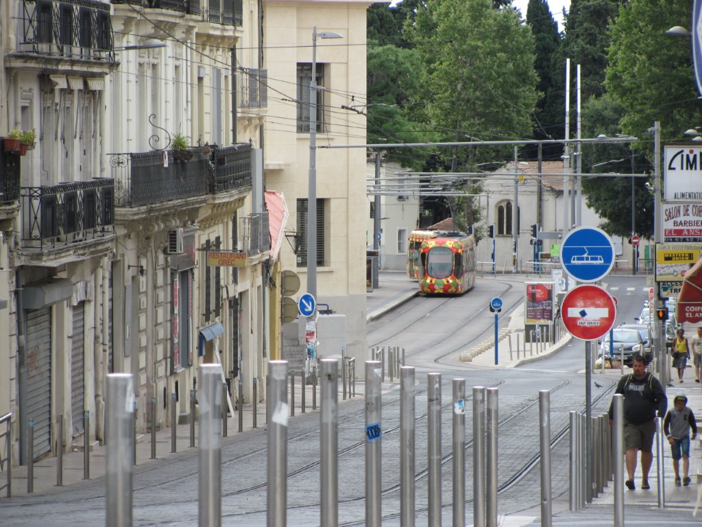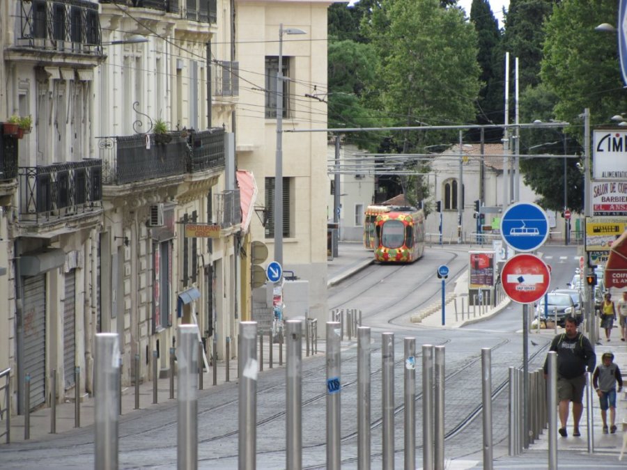 La rame 2057 Citadis 302 Alstom est photographiée du côté de la station « Place Carnot » alors qu’elle effectue sa grande boucle pour revenir à la station de secours de la ligne 2 « Gare Saint-Roch », rue Jules Ferry à Montpellier, le jeudi matin 14 juillet 2016. Copyright : Edouard Paris