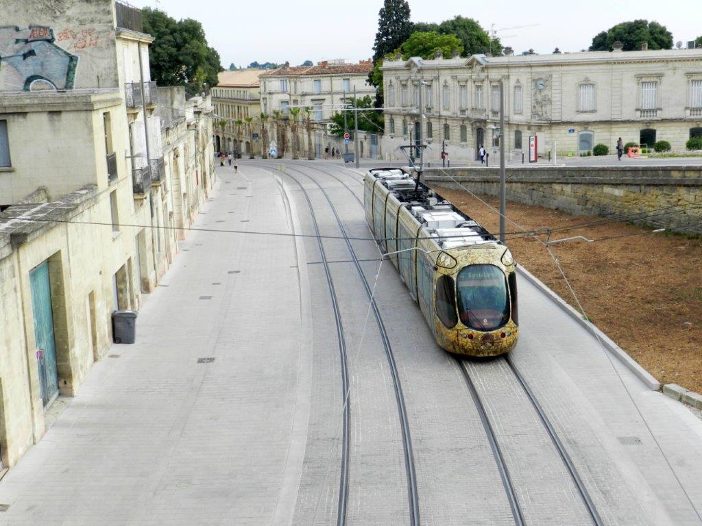 Vers 18h15, le mercredi 20 juillet 2016, boulevard du Professeur Louis-Vialleton à Montpellier, côté sud, seule une rame Citadis 302 Alstom opérant sur la ligne 4 de tramway bouclée circule sur cette artère dont les trottoirs élargis sont apparemment boudés par les piétons. Copyright : Anje34