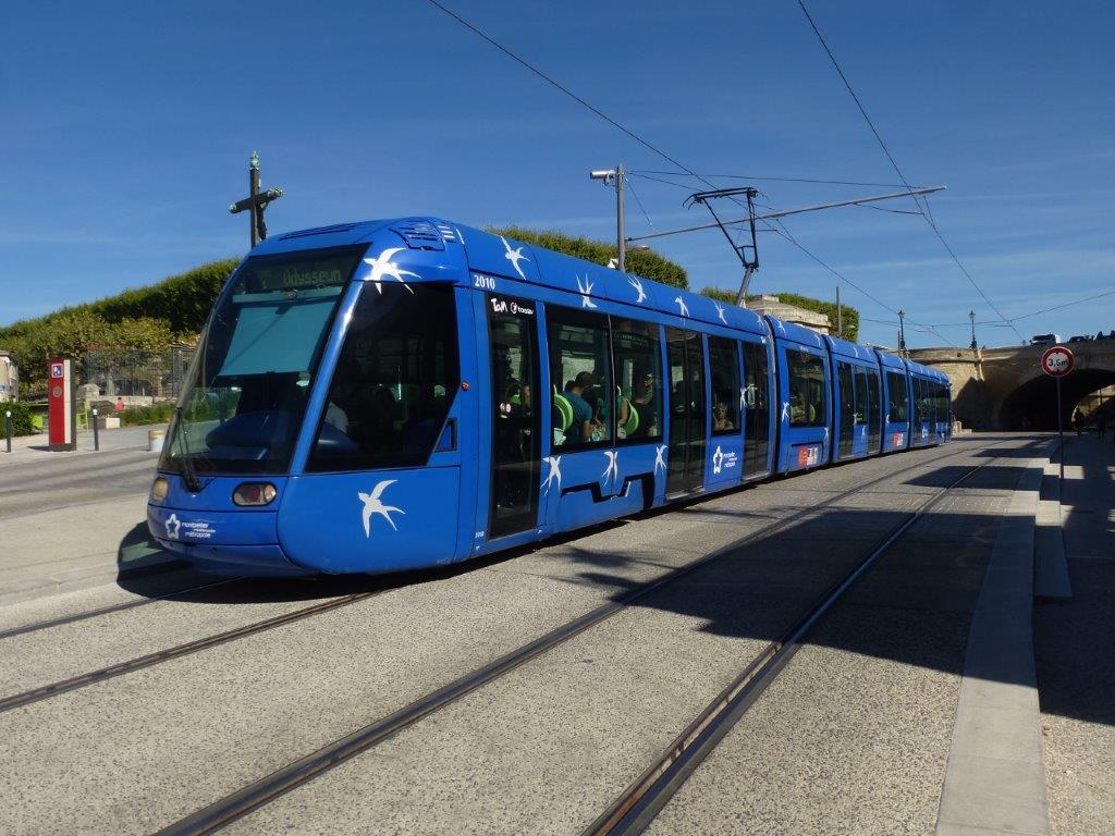 La rame 2010 Citadis 401 Alstom, en direction du terminus « Odysseum », est photographiée sur le boulevard du Professeur Louis-Vialleton à Montpellier, le mardi 2 août 2016. Copyright : Louis Ferdinand