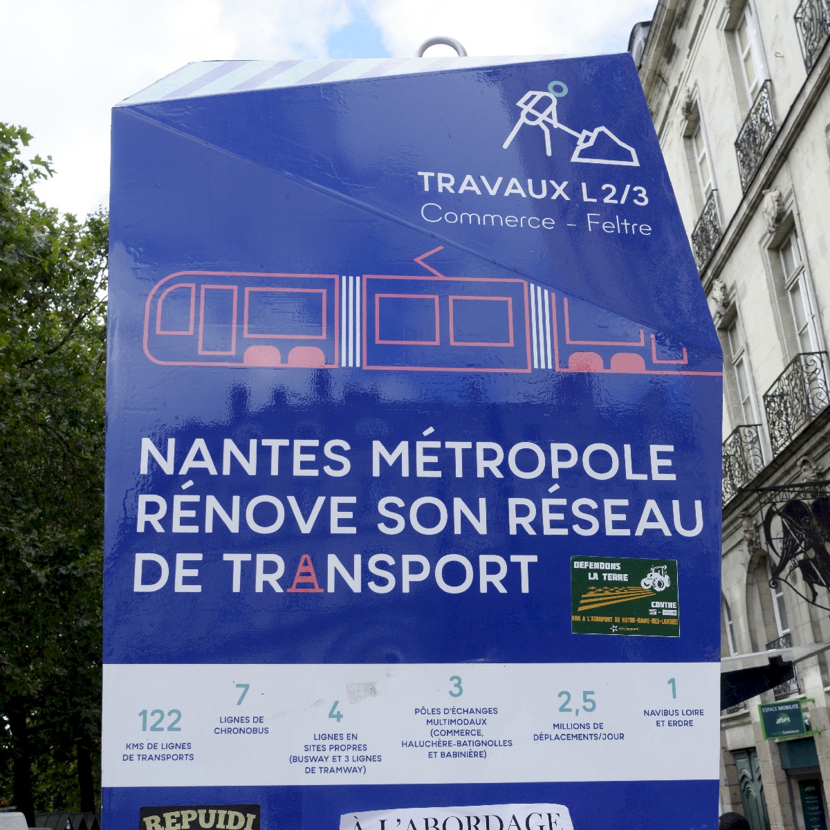 Signalétique installée dans le cadre du plus grand chantier de rénovation de voies de tramway de France en centre-ville de Nantes. Photo prise le vendredi 29 juillet 2016. Copyright : Yvon Brument
