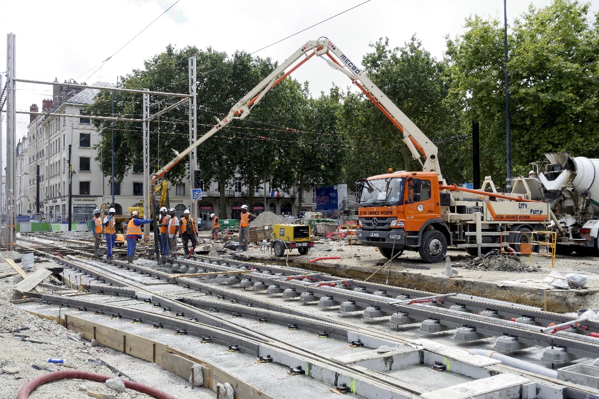 Aperçu du chantier de rénovation des voies des lignes 2 et 3 de tramway, cours des 50 Otages à Nantes, secteur Commerce, le vendredi 29 juillet 2016. Copyright : Yvon Brument