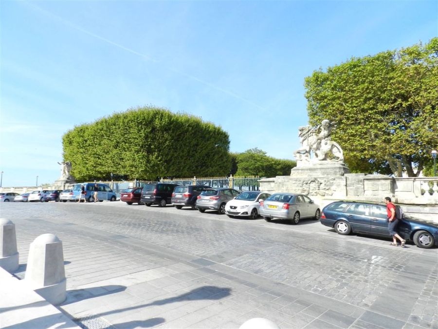 Stationnement de véhicules devant les grilles de la place royale, ça n’était jamais arrivé avant le mois de juillet 2016 de mémoire de Montpelliérains. Photo prise le jeudi 11 août 2016. Copyright : Anje34