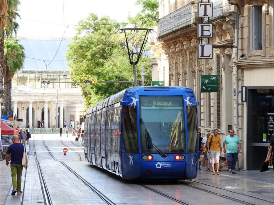 La rame 2005 Citadis 401 Alstom, à destination du terminus « Odysseum », est photographiée rue Maguelone à Montpellier, le vendredi 12 août 2016. Copyright : Anje34