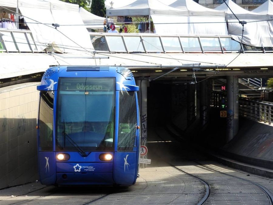 La rame 2026 Citadis 401 Alstom pointe son nez à la sortie de la galerie des tags de Montpellier, le vendredi 12 août 2016. Copyright : Anje34
